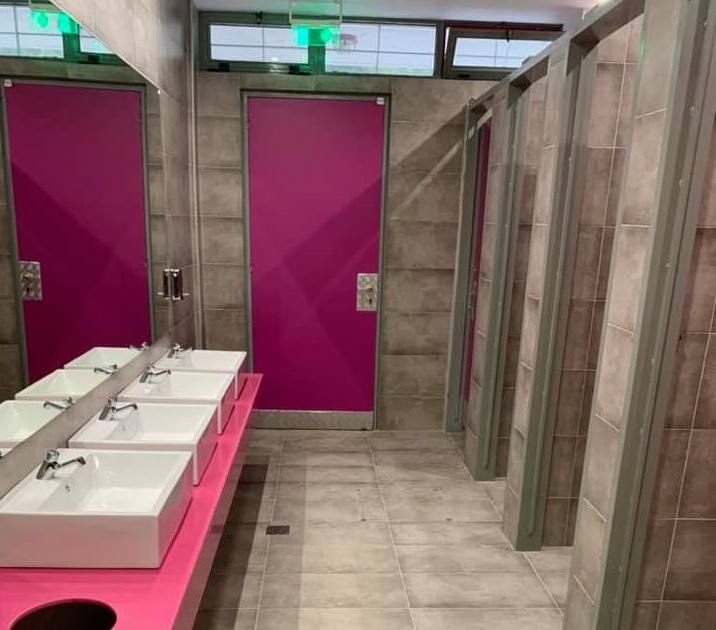 Αγοράστηκαν καθρέφτες και είδη υγιεινής και πλέον οι τουαλέτες του σχολείου είναι σε φούξια και μπλε αποχρώσεις που εντυπωσιάζουν όσους τις βλέπουν.